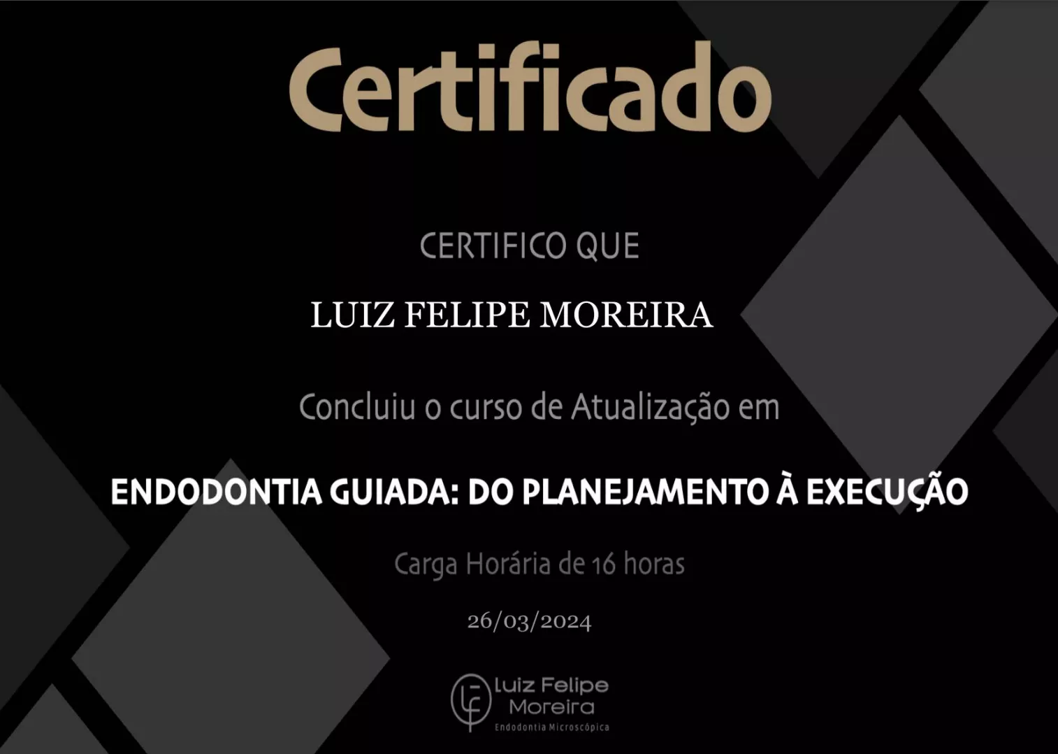 Alunos podem emitir esse certificado de atualização em Endodontia Guiada ao final do curso. Esse certificados podem ser compartilhados em redes sociais como o LinkedIn e inseridos em informações curriculares.